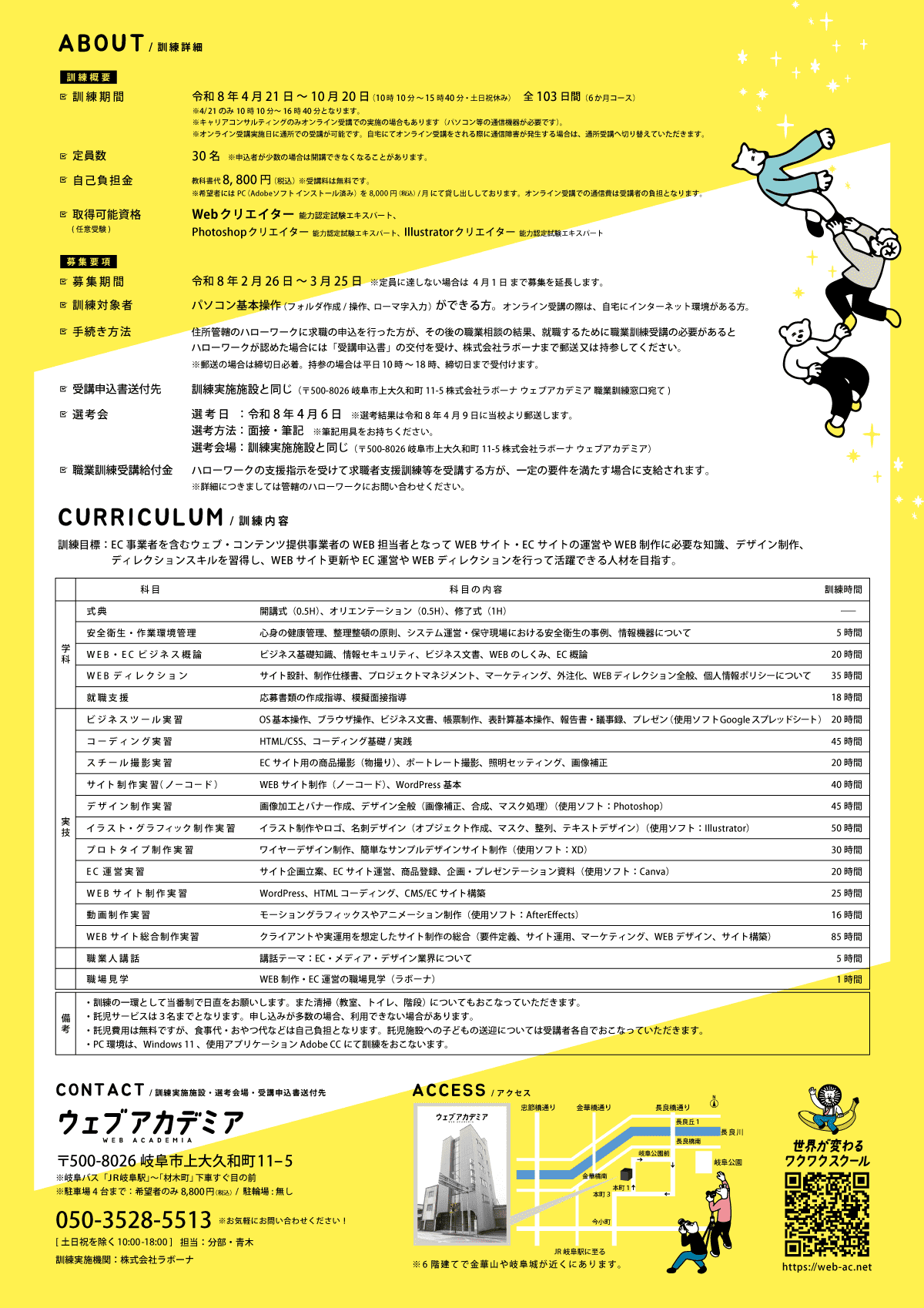 ・選考日:令和8年4月6日 ※選考通知は令和8年4月9日に当校より郵送にて行います。 ・選考方法:面談・筆記 ※筆記用具をお持ちください。 ・選考会場:訓練実施施設と同じ (〒500-8026 岐阜市上大久和町11-5 株式会社ラボーナ ウェブアカデミア)